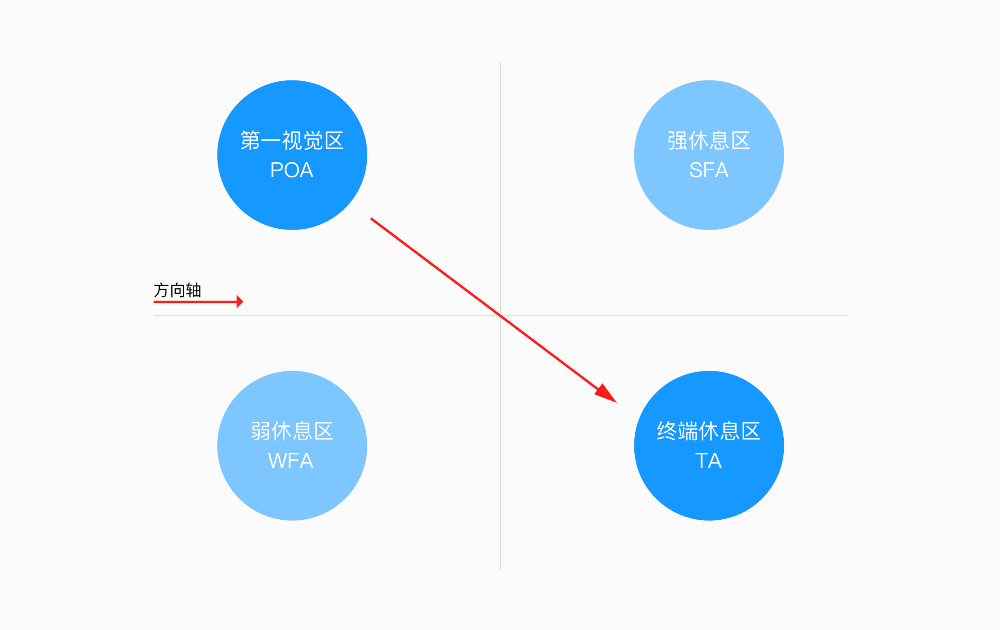 从图中可以看出,用户视线很自然的会从第一视觉区开始,逐渐移动到终端休息区。整个阅读过程视线都会沿着一条方向轴开始从左到右浏览。用户会更容易关注到页面的开始与结束区域,而中间的段落则很少被关注到。古腾堡揭示了一个实用的视觉轨迹规律:阅读引力是从上到下,从左到右。