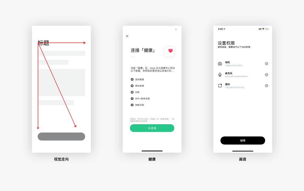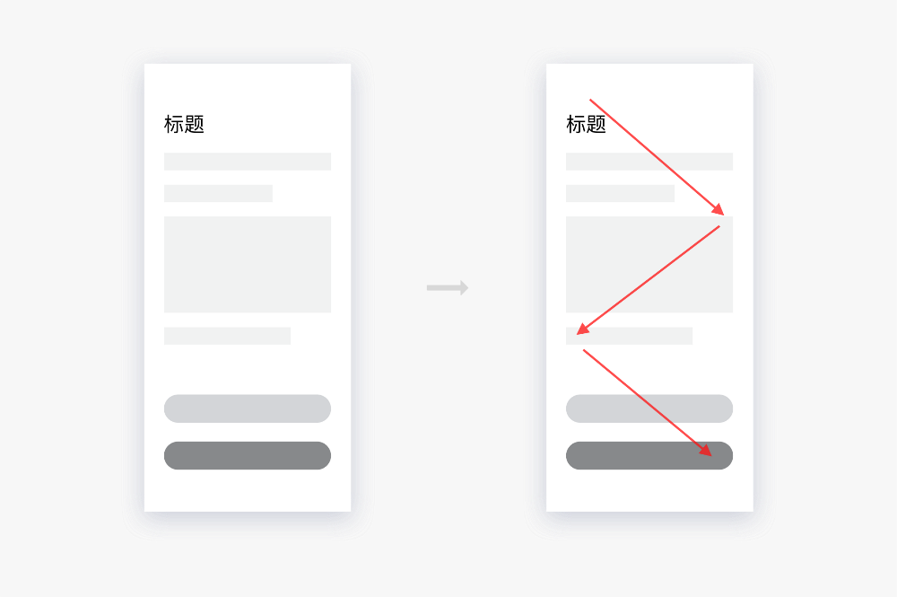 根据古腾堡原则,当用户浏览一个陌生的界面时,浏览是用户的第一行为。他们的视觉焦点会从左上角一直到右下角。并停留在结尾的行动点上,也就是前面所提到的终端休息区。接下来,就是如何摆放按钮了,这也是至关重要的一步。如果是需要用户阅读完后进行操作的话,按钮摆放的最佳位置应该是页面底部。这样可以保证用户对内容进行了阅读。