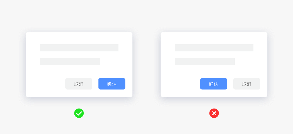 弹窗的目的是想让用户点击「确认」按钮,如果将「确认」放在左侧,根据古腾堡原则,用户的视线会不由自主的向右侧移动,也就是「取消」按钮的位置,想要回到左侧「确认」按钮位置就需要移动视线,并且眼睛的运动轨迹会在水平方向轴上来回的往复运动,无形中增加了用户选择时长。如果将「确认」放在右侧,「取消」放在左侧则可以为用户提高操作效率。