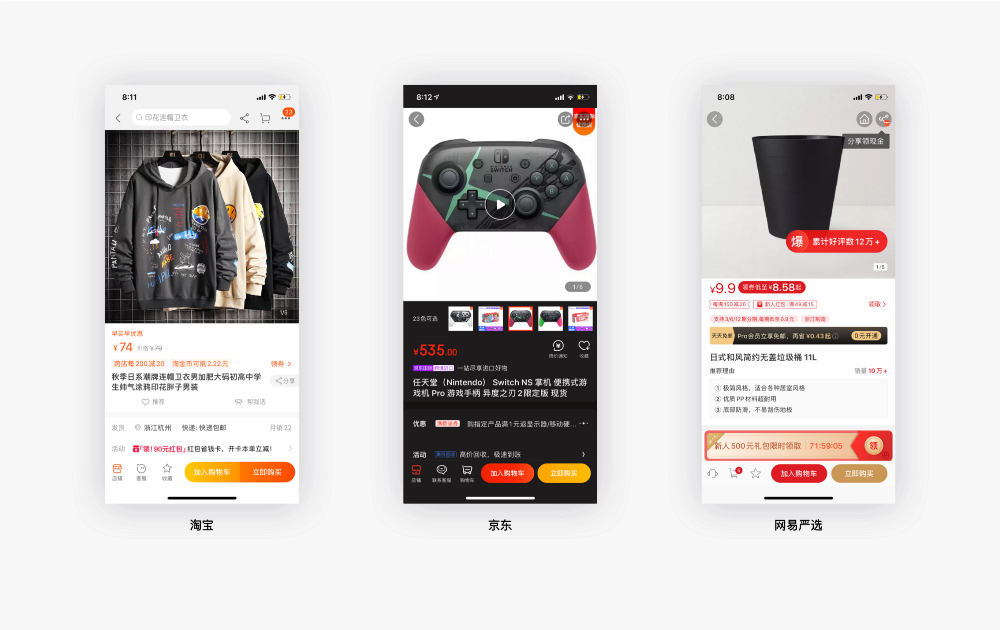 除了上面提到的顶部按钮和底部按钮,还有水平摆放的按钮,比如淘宝详情页、京东详情页、网易严选详情页的「加入购物车」和「立即购买」按钮,界面中的「立即购买」按钮都放在了右下角,结合古腾堡原则的视觉终点说明,右下角为视觉终端区域,即视觉最终停留的位置,所以他们都将与转化率密切相关的「立即购买」按钮放在了界面的右下角,让用户更容易关注到。