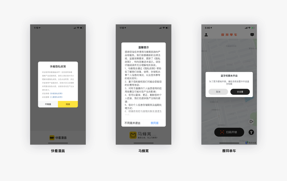 为了保证「同意」与「拒绝」这两个独立的按钮能够被用户足够的重视,并且其中的任意一个按钮不会被轻易的忽略掉,这里将「同意」按钮颜色加重,并且放在「拒绝」按钮之上,让眼睛原本垂直向下的运动轨迹产生回流的变化。